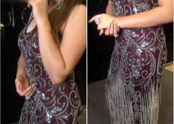 ВЕЧЕРНИЙ ДЛИННЫЙ САРАФАН-СТРЕЙЧ С БАХРОМОЙ ИЗ БИСЕРА, РАСШИТ БИСЕРОМ И ПАЙЕТКАМИ ВРУЧНУЮ ЛУЧШИМИ ИНДИЙСКИМИ МАСТЕРАМИ.