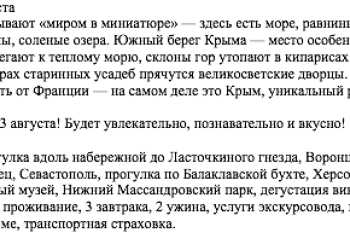 Отдых в Крыму,прогулка по набережной города Севастополя,посещение Никитского ботанического сада и многое другое.