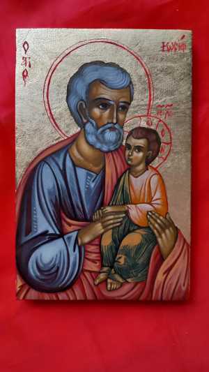 Икона Иосиф Обручник с младенцем Христом. Доска, золото, кость, минеральные пигменты, пластиковый киот. Размер 18х13 см.
