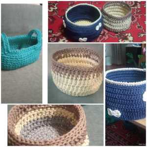 Корзинки и лукошки, связанные из шнура, цена от 400руб., зависит от размера, донышки деревянные и связанные крючком.